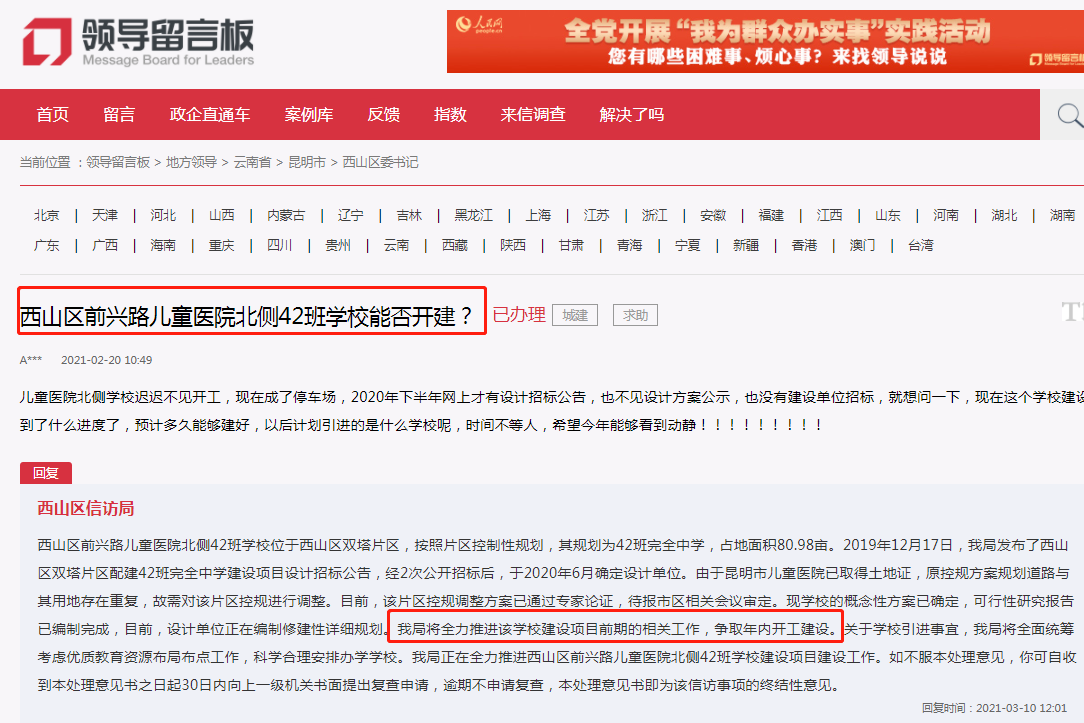 值得一提的是,今年3月底,有网友通过地方领导留言板咨询,南市区儿童医院旁的学校何时开建?对此,西山区信访局作出回应:正全力推进该学校建设项目前期的相关工作,争取年内开工建设。