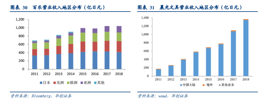 以百乐和晨光为例,百乐的销售额其实是四大地区共同发力,而晨光却主要是依靠中国市场。