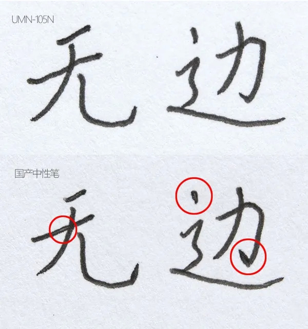 对比三菱和国产中性笔写出的笔画,明显能看出国产笔溢墨现象很严重。