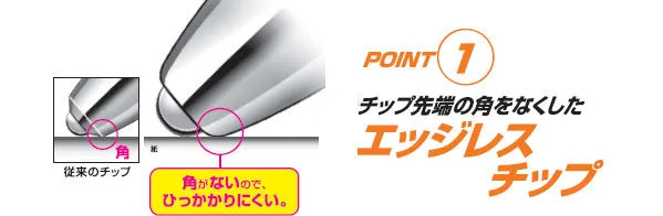 三菱在笔方面的黑科技最值得一提的,就是笔尖弧形打磨技术,简单来说,就是通过打磨笔尖边缘的弧角,来减小摩擦力。