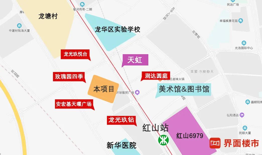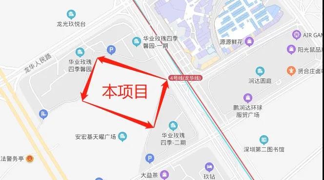 这块宗地位于龙华红山片区,被华业玫瑰四季的高楼“三面围攻”,仅剩的西南面,也被安宏基天曜广场所阻挡,有点“盘中盘”的意味。
