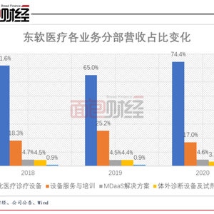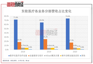 从2018年至2020年东软医疗各业务分部的营收占比变化来看,数字化医学诊疗设备、设备服务与培训业务始终占据主导地位,两者合计的营收占比均接近或超过公司整体营收的九成。