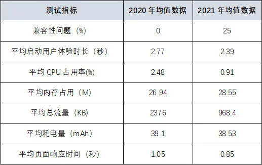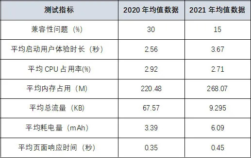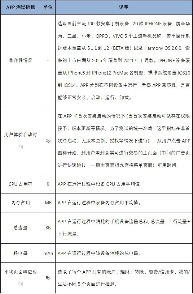 本次测试共分为APP兼容性测试、性能测试、其他测试三大方面,共7个指标。包括主流手机设备兼容情况、APP用户体验启动时间、CPU占用率、网络流量、内存占用、电量消耗、5个典型页面的响应时间。