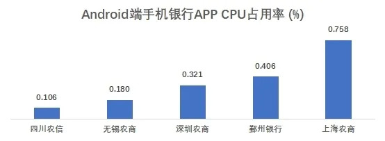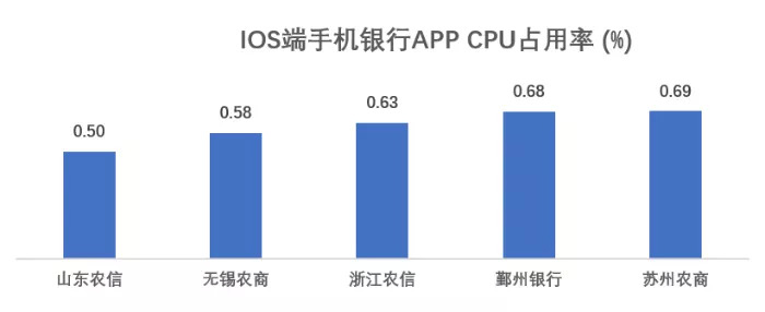 在IOS客户端,手机银行APP运行时的CPU占用率在0.5%到1.37%不等,平均占用为0.91%,中位数为0.87%,最高占用为1.37%。其中,CPU占用率最低为山东农信手机银行APP,运行时平均占用达0.5%。