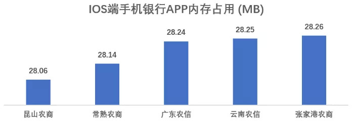 在IOS客户端,20家农村商业银行APP 运行时的内存占用是28.06MB到30.64MB不等,差距较小,平均占用为28.55MB,中位数为28.42MB,最高占用为30.64MB。其中,最低内存占用为昆山农商手机银行APP,运行时平均占用28.06MB。