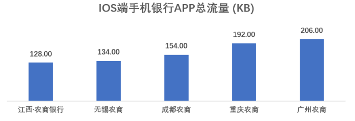 在IOS客户端,20家农村商业银行APP 运行时2分钟随机点击消耗总流量128KB到1991KB不等,平均消耗968.4KB,较去年同业流量消耗2376KB有较大优化,中位数为1039.5KB,最高为1991KB。其中,最低流量消耗为江西·农商银行手机银行APP,运行消耗流量仅为128KB。