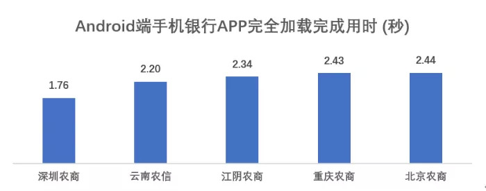 在安卓客户端,20家农村商业银行启动用户体验时间分布在1.76秒到9.85秒之间,差别较大,平均为3.67秒,平均用时明显高于去年的2.56秒,中位数为3.40秒,最大为9.85秒。其中,深圳农商银行手机银行APP启动用户体验时间最短,从用户点击APP图标到可操作的首页面完全加载完成仅用时1.76秒。