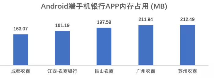 在安卓客户端,20家农村商业银行APP 运行时内存占用是163.07MB到430.32MB不等,平均占用为268.07MB,中位数为263.79MB,最高占用为430.32MB。其中,最低内存占用为成都农商手机银行,运行时平均占用163.07MB。