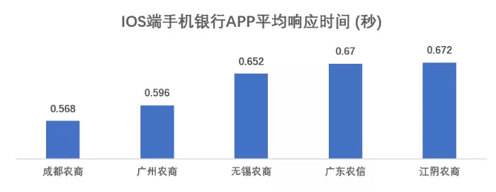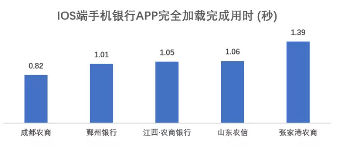 在IOS客户端,20家农村商业银行启动用户体验时间分布在0.82秒到11.3秒之间,平均为2.39秒,较去年2.77秒有较大提升,中位数为1.82秒,最大为11.3秒。其中,成都农商手机银行APP启动用户体验耗时最短,从用户点击APP图标到可操作的首页面完全加载完成用时为0.82秒。