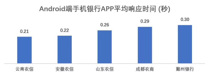 20家农村商业银行在安卓和IOS客户端APP页面的平均响应时间较快。安卓客户端,手机银行APP“账户”、“理财产品”、“缴费”、“转账”和“我的页面”平均响应时间从0.21秒到1.1秒不等,平均为0.45秒,中位数为0.39秒,最慢为1.1秒。其中,响应时间最短的是云南农信手机银行APP,仅为0.21秒。