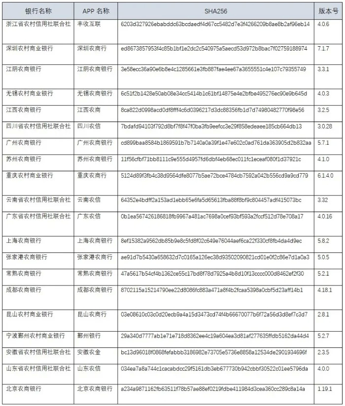 本次测试包含20家农村商业银行的个人手机银行安卓和IOS手机客户端,包括了北京农商银行、上海农商银行、张家港农商银行、常熟农商银行、成都农商银行、深圳农村商业银行、江阴农商银行、无锡农村商业银行、江西·农商银行、广州农商银行、苏州农商银行、重庆农村商业银行、昆山农村商业银行、宁波鄞州农村商业银行、浙江省农村信用社联合社、安徽省农村信用社联合社、山东省农村信用社联合社、四川省农村信用社联合社、云南省农村信用社联合社、广东省农村信用社联合社。(银行顺序随机排布)