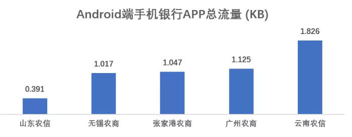 20家农村商业银行安卓和IOS客户端APP网络流量普遍在可接受范围内,与去年同期数据对比流量消耗明显下降。在安卓客户端,手机银行APP运行时2分钟随机点击消耗总流量是0.391KB到33.309KB不等,平均消耗9.295KB,较去年平均消耗67.57KB,性能同比提升7倍有余,中位数为3.818KB,最高为33.309KB。其中,山东农信手机银行APP流量消耗最低,运行时流量消耗仅为0.391KB。
