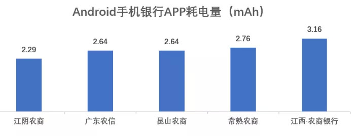20家农村商业银行安卓和IOS客户端APP电量消耗均在可接受范围内,安卓端平均耗电量较去年增加近一倍。其中,安卓客户端APP 运行时2分钟随机点击消耗总电量2.29毫安到28毫安不等,平均消耗6.091毫安,较去年增加近一倍,中位数为4.525毫安,最高消耗为28毫安。最低电量消耗为江阴农商手机银行APP,运行消耗仅为2.29毫安。
