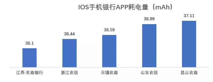 IOS客户端APP 运行时2分钟随机点击消耗总电量36.1毫安到41.25毫安不等,平均消耗38.53毫安,中位数为38.22毫安,最高消耗为41.25毫安。最低电量消耗是江西·农商银行手机银行APP,运行消耗36.1毫安。