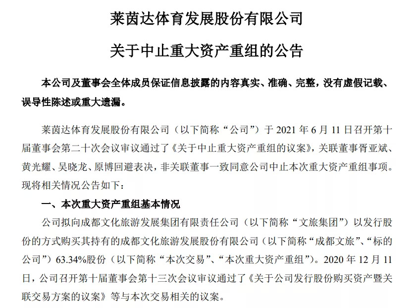 6月14日晚间,莱茵体育(SZ 000558)发布公告,“中止”收购成都文旅(834833.OC)股份63.34%的控股权,公告解释称,2020年初爆发的新冠疫情对全国滑雪场带来较大冲击,致使本次被收购公司业绩持续受到影响。“现阶段,国际国内疫情依然具有较大不确定性,对体育运动和文旅产业的影响依然存在。待条件成熟时,公司再行择机在符合相关法律法规的前提下启动相关事项。”