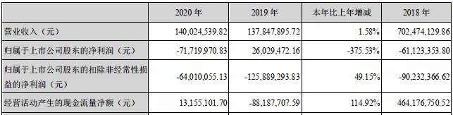 数据显示,2016年至2020年,莱茵体育营业收入分别为38亿元、13.24亿元、7.02亿元、1.38亿元和1.40亿元;净利润分别为2519.22万元、2850.21万元、-6112.34万元、2602.95万元和-7172.00万元;扣非净利润分别为1423.22万元、-5637.18万元、-9023.24万元、-1.26亿元和-6401.01万元。
