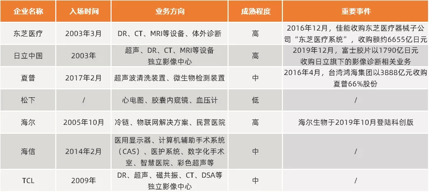 国内的巨头有着同样的行为轨迹。由于家电消费市场及经济水平发展落后于日美速度,家电企业虽在二十年来尽享发展红利,但也存在饱和危机。因此,多元化布局已成为他们的必选项,医疗是其发展方向之一。