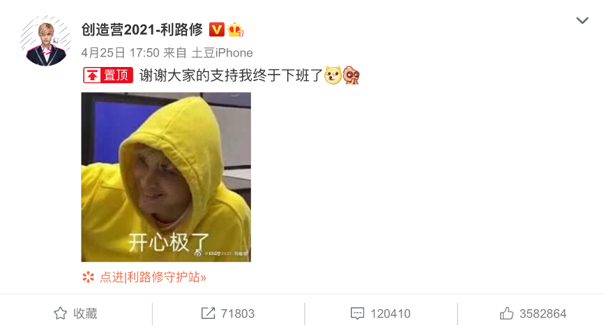 首先,这与利路修超高的人气和话题度密不可分。以《创4》结束后利路修发的第一条微博为例。至今,这条下岛感言的点赞量突破了350万,超过了最终组成INTO1的11人出道后第一条微博点赞量的总和。