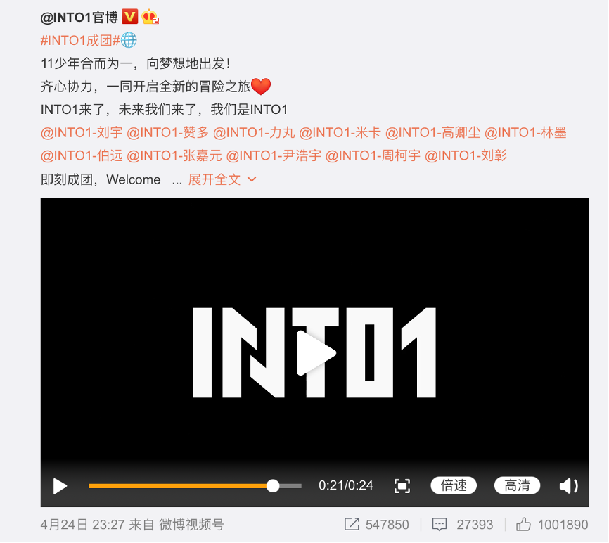 目前,INTO1官博在同一天发布的成团消息的点赞量也不过刚刚突破100万,而这条官博下的2万多条评论,更是远低于利路修微博的12万条。