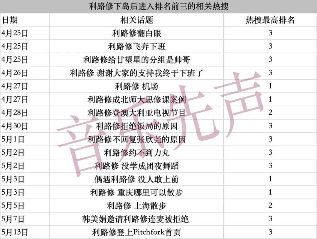 据音乐先声不完全统计,下岛至今,利路修共接了23条广告,拍了4家时尚杂志,上了2场综艺和1场音乐节。