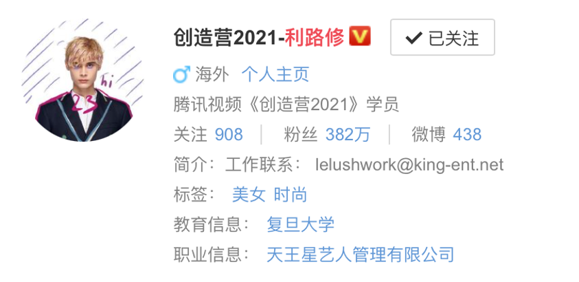 截至6月16日,利路修以389万粉丝成为《创4》微博粉丝最多的人,甚至高于C位出道的刘宇(357万)。