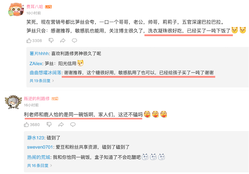 而在6月15日发布的最新视频《打哥哥?捶哥哥?找哥哥单挑?我从来没见过这么缺德的粉丝!【利路修】》的片尾,三代鹿人更是毫不避讳地为利路修代言的BUFFX糖插入了硬广告,观众们也纷纷在评论区玩起了“恰饭梗”。