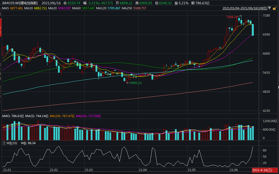 6月16日,锂电池板块领跌A股市场。东方财富Choice数据的锂电池指数(861057.EI)当日跌5.1%,Wind锂电池指数(884039.WI)大跌5.31%。