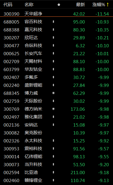 当日,东方财富Choice数据汇总的225只锂电池概念股中,169只飘绿,只有46只股价上涨。其中,长安汽车(000625.SZ)、天赐材料(002709.SZ)、华友钴业(603799.SH)、多氟多(002407.SZ)、盛新锂能(002240.SZ)、天际股份(002759.SZ)、雅化集团(002497.SZ)、安纳达(002136.SZ)等8只锂电池概念股触及跌停板;容百科技(688005.SH)、嘉元科技(688388.SH)、天华超净(300390.SZ)、欣旺达(300207.SZ)、合纵科技(300477.SZ)等跌幅超10%。