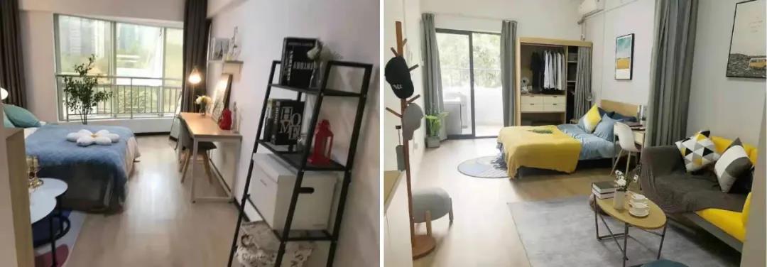 其中,公寓式房源的装修最为精致,在基础家具之上,配齐密码门锁、空调、抽油烟机、滚筒洗衣机等家电配套,并且更注重功能区布局设计、装修美观度等等。