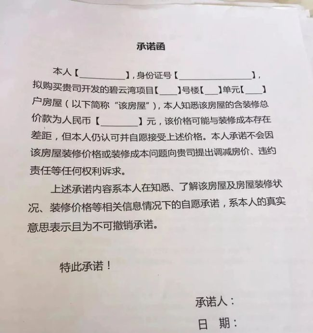据“腾讯房产青岛站”的文章,在精装修方面,花样年碧云湾和业主签署了强硬的承诺函:让业主承认项目与装修成本存在差距,但承诺不会因为房屋装修价格或者装修成本问题向贵司提出调减房价、违约责任等任何权利诉求。