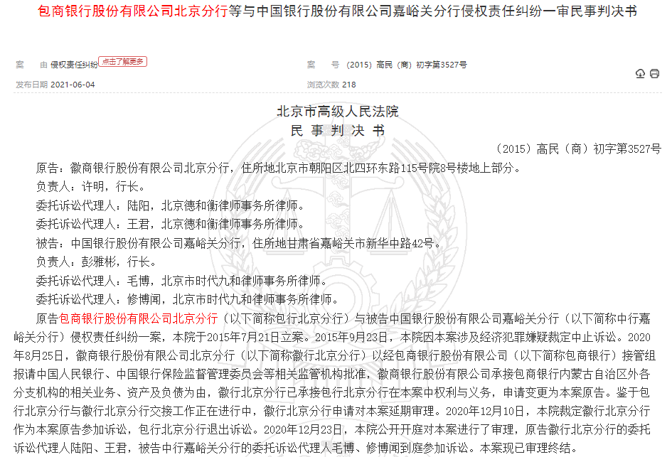 事实上,包商银行在去年已经被接管。一审判决书显示,2020年8月,徽行北京分行已承接包行北京分行在本案中权利与义务,申请变更为本案原告。