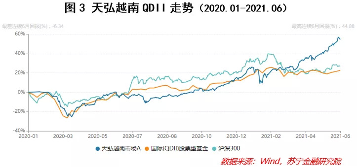 这支基金成立于2020年1月20日,主要跟踪的是VNI30指数,由胡志明交易所30支市值最大公司且兼具流动性的股票构成,其中金融且主要为银行的市值占比近40%,房地产企业的市值占比25%左右,基础材料加上必需消费品类的企业市值占比近20%。从2020年1月成立至今,其涨幅高达55%,显著优于同期的沪深300指数及其它QDII基金。从2021年初至今算起,涨幅更是可排进纳入统计的主动权益类基金前十。