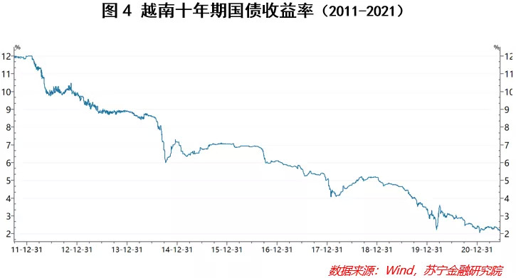 首先看利率,越南货币政策近年来一直保持比较宽松的状态。为了有效应对疫情带来的冲击,利率从疫情前的6%左右大幅调低至4%,为过去20年最低的利率水平。代表其国内资产定价的“锚”,十年期国债收益同样大幅走低,由此也推高了市场对于权益类资产的偏好。
