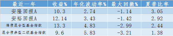 风险提示:文中观点仅代表个人观点,不作为对投资决策承诺,文章内信息均来源于公开资料,本文作者对这些信息的准确性和完整性不作任何保证。文章中的内容和意见基于对历史数据的分析结果,不保证所包含的内容和意见在未来不发生变化。本文仅供参考,在任何情况下,本文中的信息或所表述的意见均不构成对任何人投资建议。文中基金业绩数据截至2021.05.31,安隆回报、安裕回报基金年化波动率、最大回撤和夏普比率来自万得;混合债券型二级基金指数、偏债混合型基金指数数据来自万得。