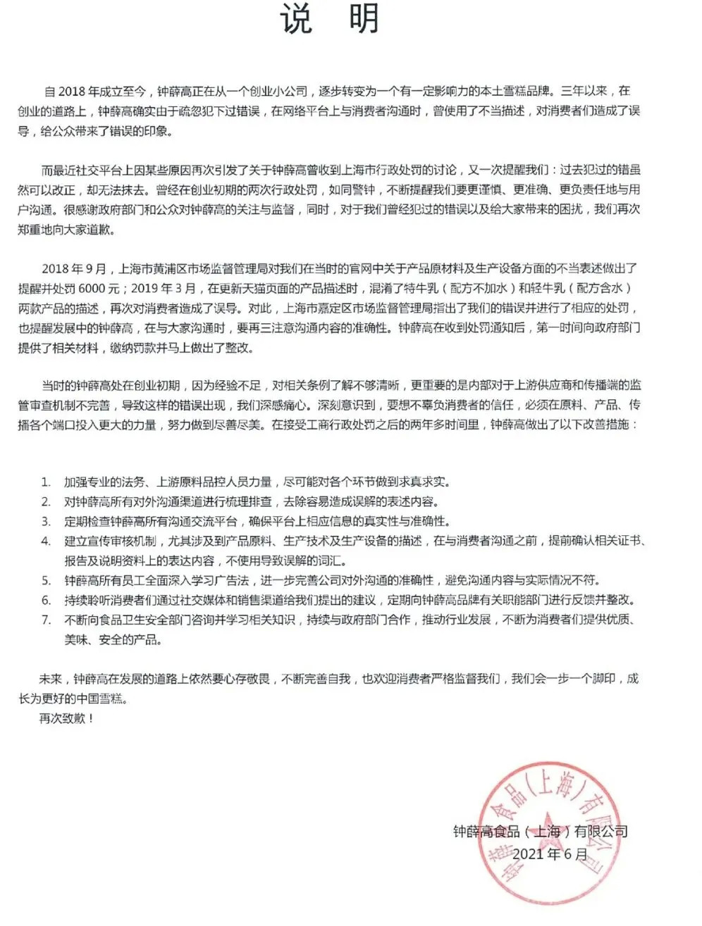 6月17日晚,钟薛高在其官方微博发布道歉信称:“最近社交平台上因某些原因再次引发了关于钟薛高曾收到上海市行政处罚的讨论,又一次提醒我们:过去犯过的错虽然可以改正,却无法抹去。曾经在创业初期的两次行政处罚,如同警钟,不断提醒我们要更谨慎、更准确、更负责任地与用户沟通。很感谢政府部门和公众对钟薛高的关注与监督,同时,对于我们曾经犯过的错误以及给大家带来的困扰,我们再次郑重地向大家道歉。”