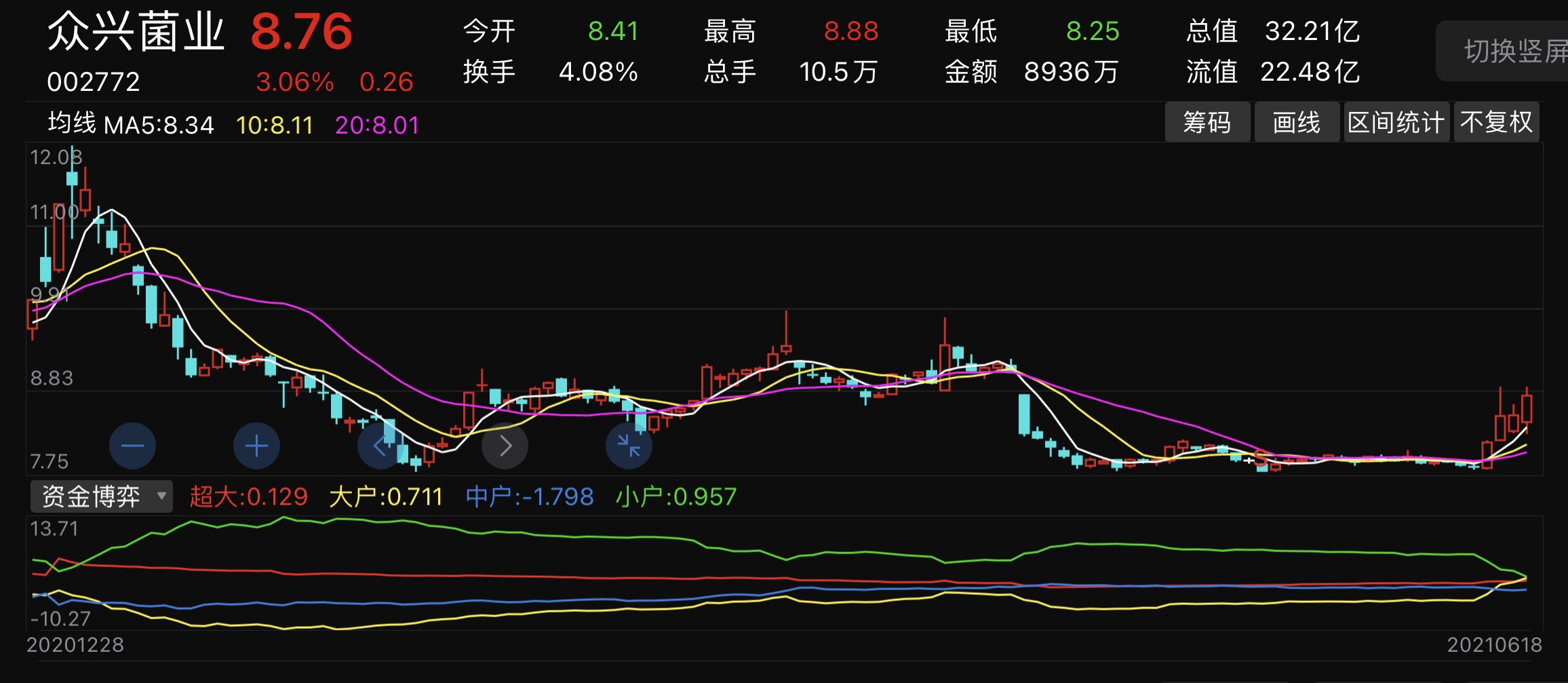 不过,从6月15日开始,该股连涨4天,阶段涨幅达13%。6月18日,众兴菌业股价回升至8.76元/股,但较该公司今年年初股价11.49元/股(2021年1月4日收盘价)仍下跌约23.76%。