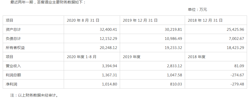 彼时公告显示,2018年、2019年及2020年前8月,圣窖酒业营业收入分别是81.09万元、2833.12万元、3394.94万元,对应的净利润分别是-279.48万元、810.03万元、1014.8万元。此外,截至2020年8月31日,该公司未经审计的资产总计是3.24亿元,涉及负债总计是1.22亿元。