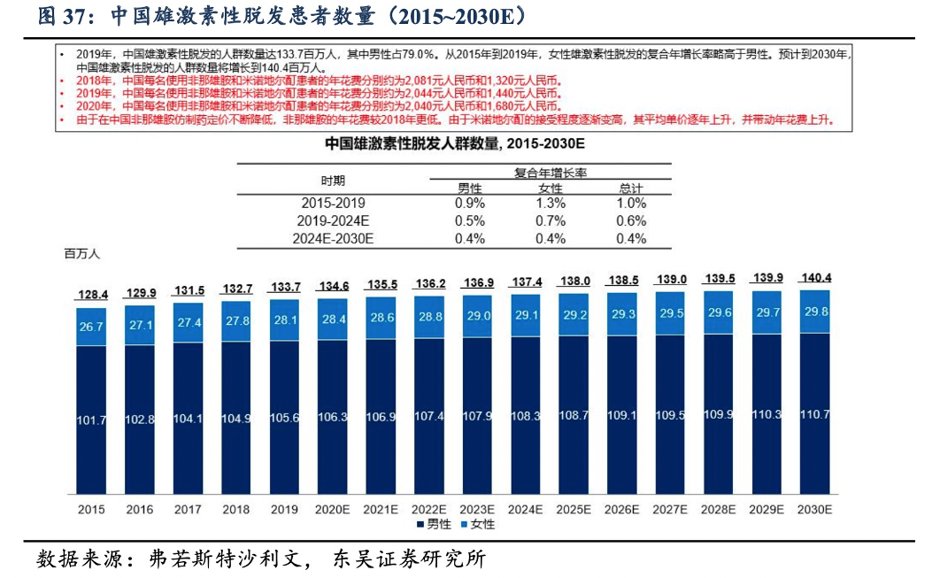 而在不同的脱发类型中,雄激素性脱发(AGA)最为常见。东吴证券研报指出,2018年,中国有超过1亿名男性患有不同程度的雄激素性脱发。患者总数预期将从2019年0.6%的复合年增长率增加至2024年的1.37亿人,从2024年0.4%的复合年增长率增加至2030年的1.4亿人。