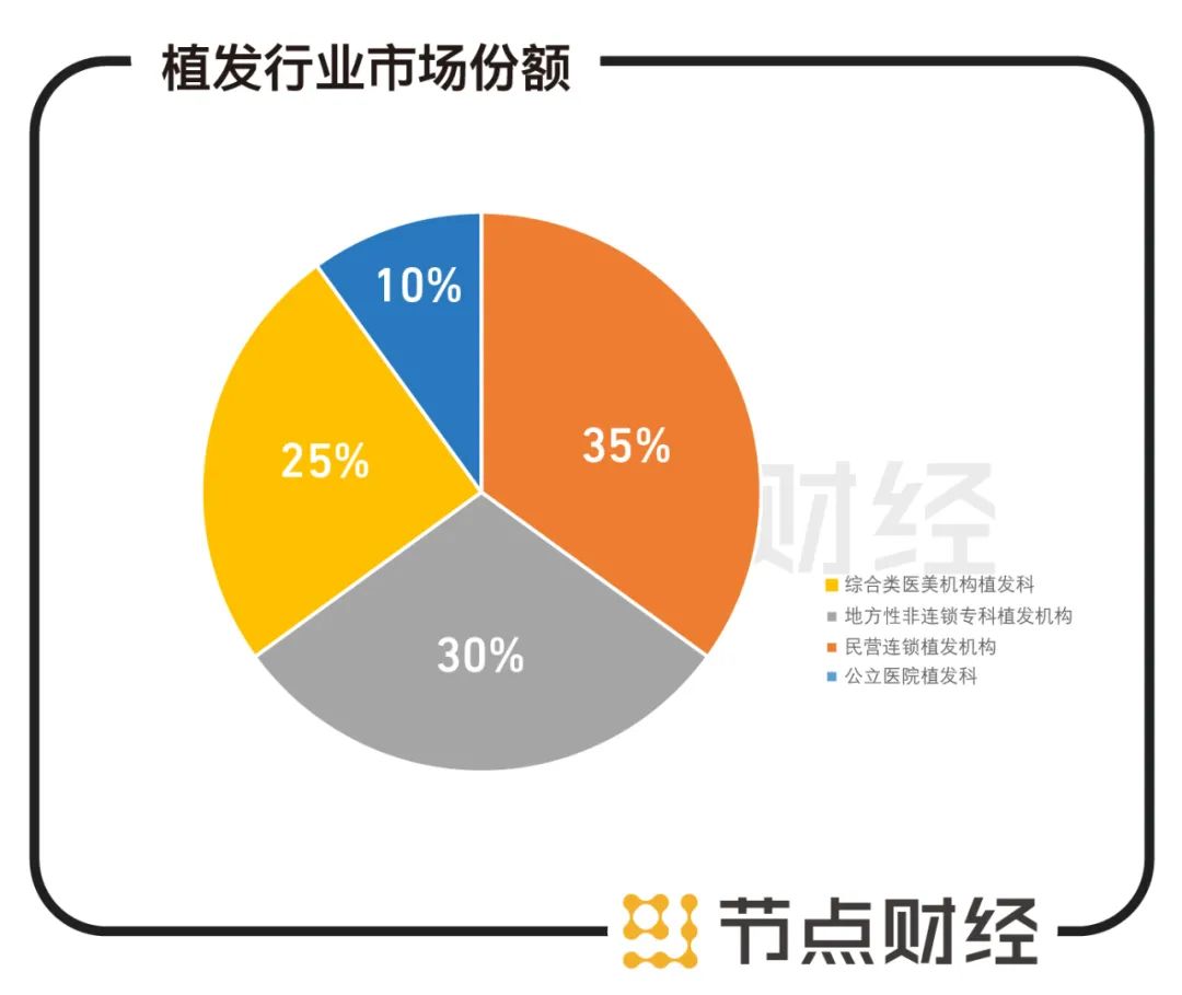 关于植发,行业则较为分散。据媒体报道,主要包括四股力量,一是民营连锁植发机构,主要包括四家头部公司——碧莲盛、雍和植发、大麦、新生植发,占据约35%的市场份额;二是地方性非连锁专科植发机构,占据逾30%;三是综合类医美机构的植发科室,占据约25%;最后是公立医院的植发科,占据剩余10%。