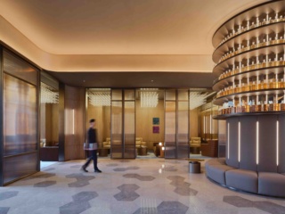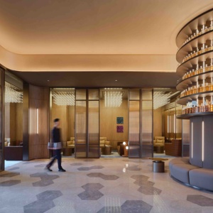 酒店离虹桥机场不远,由之前的商务楼物业改建,大堂像一个威士忌酒吧—除了简洁的前台,进门中心位置就是一个威士忌酒柜,周围设计了有沙发和茶几的会客隔间。客房里的厚重木质壁板、古铜色边框和深色瓷砖,风格与以前截然不同。客房还配置了手冲咖啡工具和威士忌尝新套装。