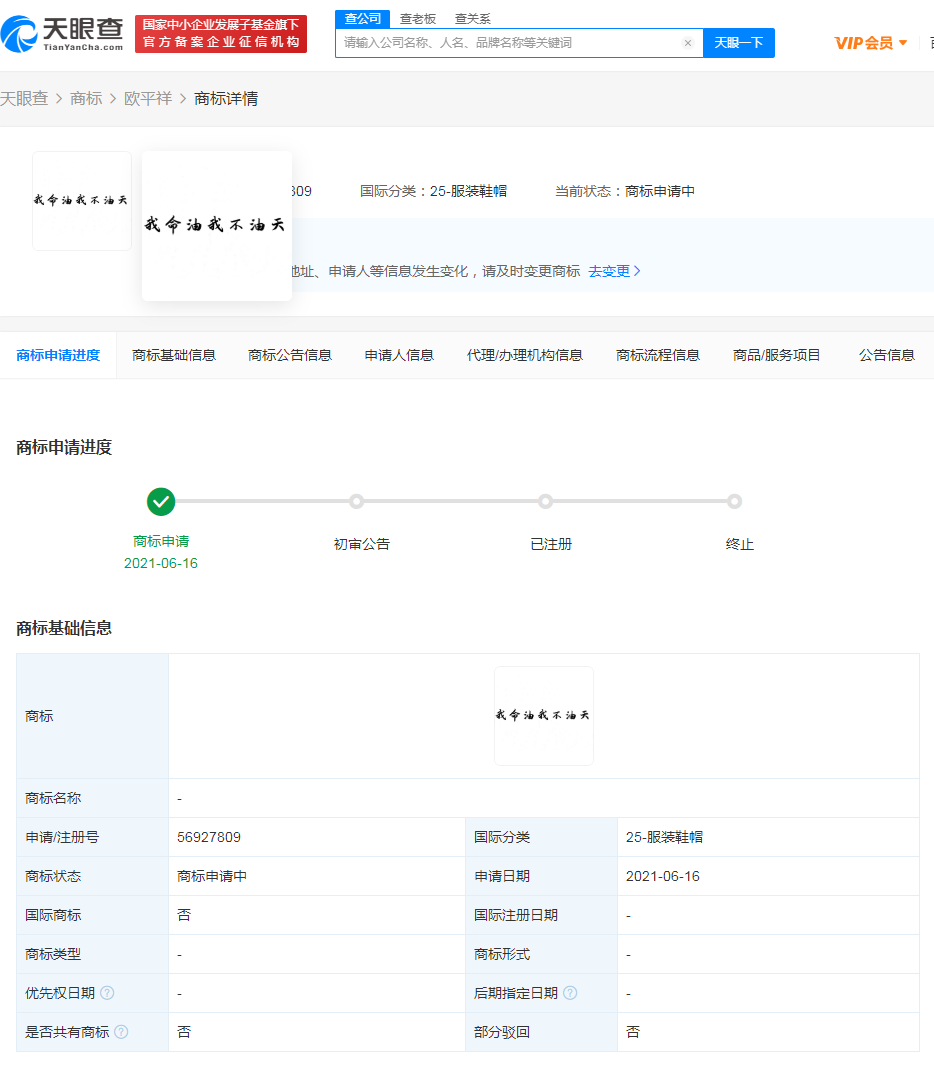 据天眼查APP显示,6月16日,欧某申请注册“我命油我不油天”商标,注册号为56927809,国际分类为服装鞋帽,商标状态为“商标申请中”。值得一提的是,欧某与王思聪并无商业关联。