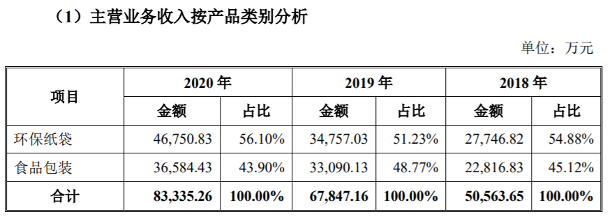 招股书显示,报告期内,南王科技的主营产品分别为环保纸袋和食品包装,其中环保纸袋的收入持续上升,占同期主营业务收入的比重均在5成以上。