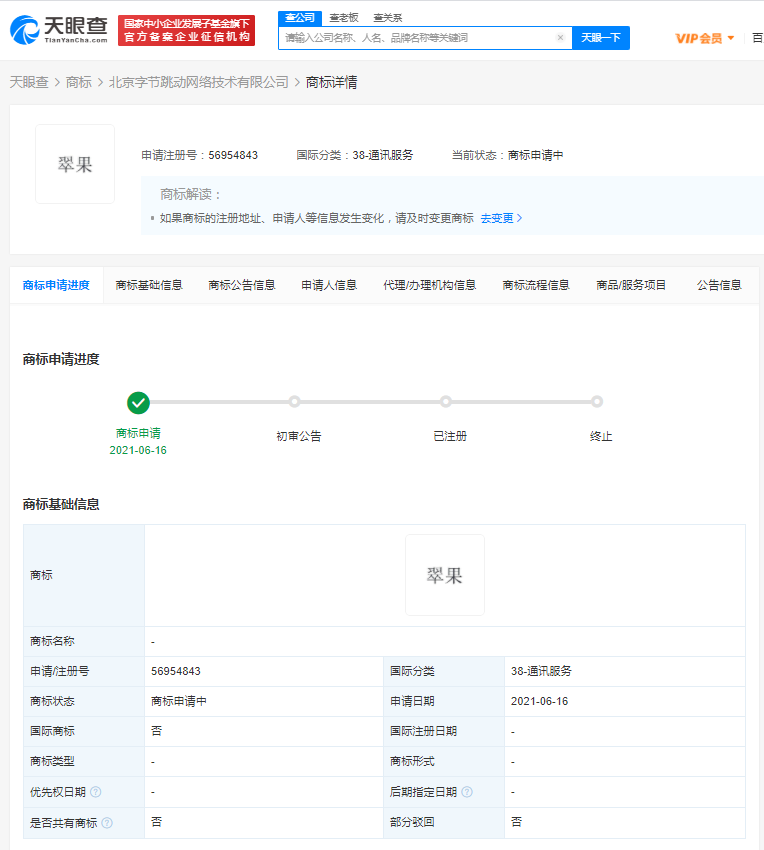 据天眼查APP显示,近日,北京字节跳动网络技术有限公司申请注册“翠果”“脆果”商标,国际分类为通讯服务、金融物管、网站服务等。目前商标状态为申请中。