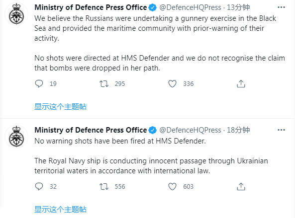 针对俄罗斯国防部6月23日称英国驱逐舰越境,俄方舰艇发出警告射击、俄方战机投射炸弹一事,英国国防部发布声明称,没有收到向“卫士”号(HMS Defender)的开火警告。英国皇家海军军舰当时正遵循国际法合规正常通过乌克兰领海。