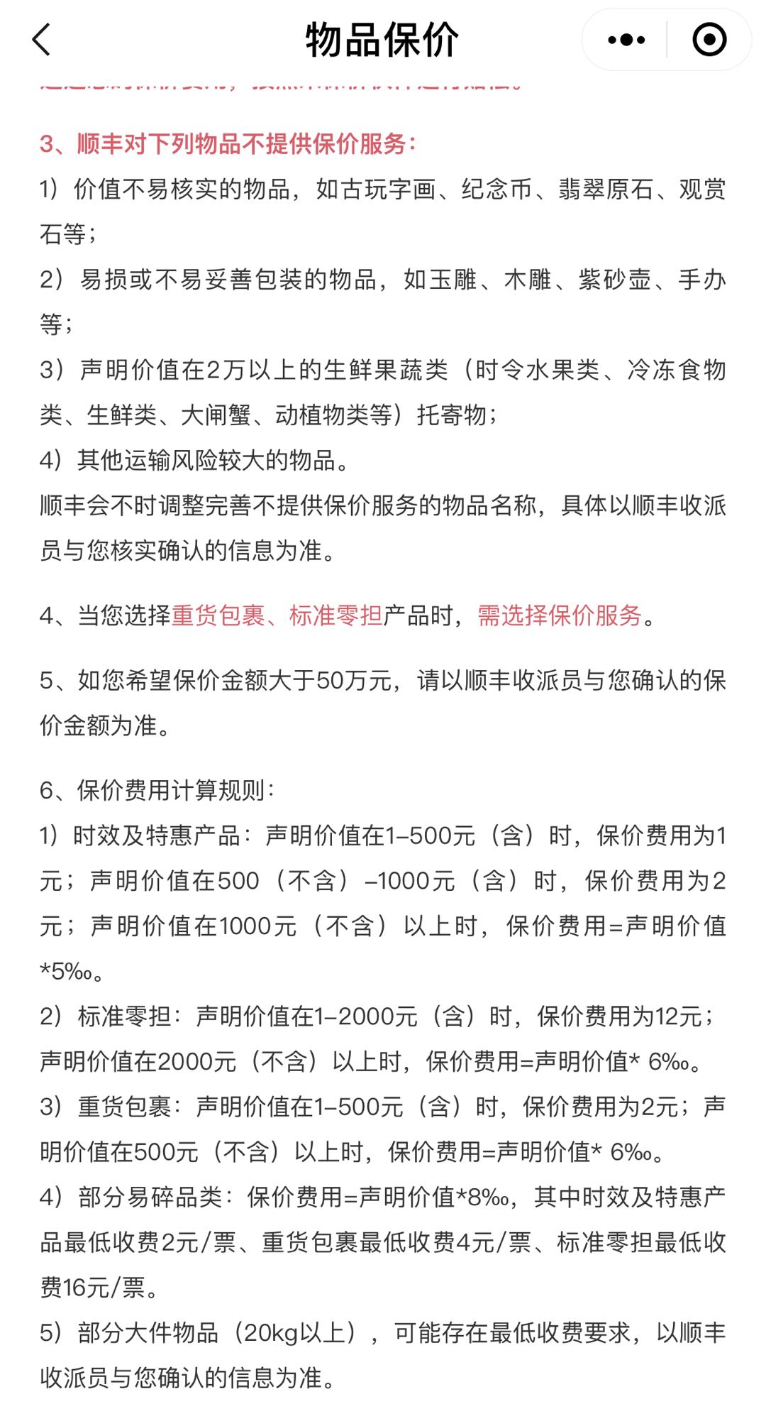 此外,价值不易核实的物品、易损或不易妥善包装的物品,如古玩字画、纪念币、翡翠原石、木雕、观赏石等,均不提供保价服务。