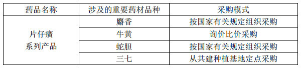 片仔癀药物涉及的重要成分包括麝香、牛黄、蛇胆、三七。其中,除麝香、蛇胆严格按国家有关规定组织采购外,牛黄、三七可通过市场渠道进行采购,采购价格随行就市。所以片仔癀的成本很大一部分取决于中药材的采购价格。