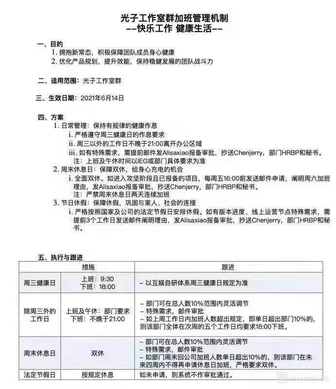 试点团队为腾讯旗下光子工作室,新规定为:周末双休;周三必须6点下班,其余工作日不准超过9点下班,违规团队下周全体6点下班;周末违规加班的团队,还要连续四周不准加班。