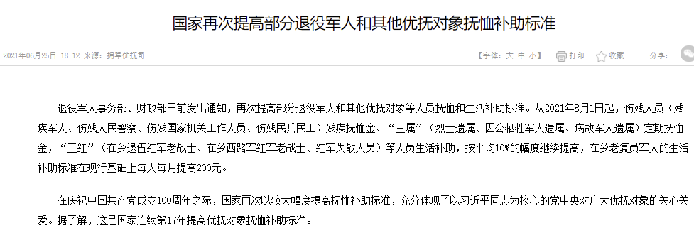在庆祝中国共产党成立100周年之际,国家再次以较大幅度提高抚恤补助标准,充分体现了以习近平同志为核心的党中央对广大优抚对象的关心关爱。据了解,这是国家连续第17年提高优抚对象抚恤补助标准。