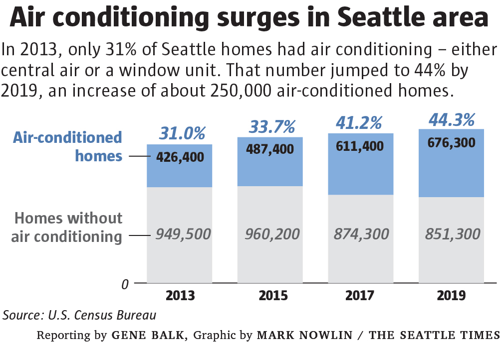 据《西雅图时报》报道,西雅图是美国空调持有比例最少的都会区。虽然近年来频繁的高温天气,和新移民的涌入让安装空调的比例明显提升,但截至2019年,当地只有44%的家庭安装了空调。