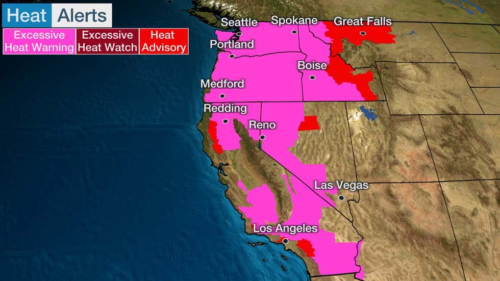 美国国家气象局表示,28日和29日,当地气温还将继续升高。该部门在华盛顿州和俄勒冈州几乎所有地区都发布了高温警告,加利福尼亚州和爱达荷州部分地区也受到影响。